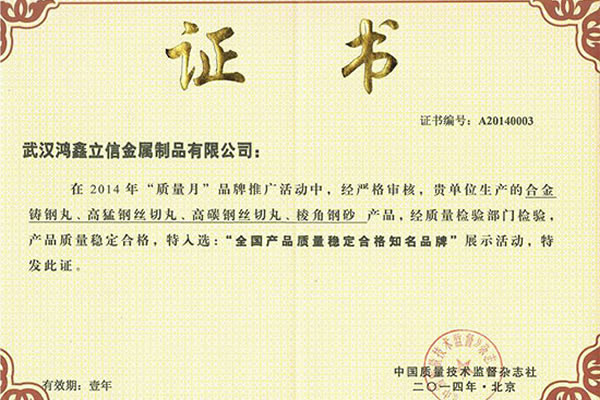 武漢鴻鑫立信金屬制品有限公司主要從事鋼丸、鋼絲切丸、鋼砂等除銹防腐耗材的生產和銷售。公司所有產品均通過ISO9001**質量認證,2014年更獲得了第三屆中國金屬磨料行業具有影響力品牌-華尊獎。董事長陳群芝女士從事行業17年來專注為客戶節約鋼丸消耗成本,2014年獲得了華尊獎-中國品牌建設實踐百名創新很好企業家的榮譽。服務過的國家建設項目有:北京鳥巢體育館、遼寧號航母、杭州灣跨海大橋、南海軍艦、成都雙流**機場、南車集團動車檢測中心、武漢火車站、武漢天興洲大橋等,同時服務的行業囊括橋梁制造、船舶制造、汽車制造、火車車輛制造、大理石打磨、鑄件清砂、各種機械制造表面清理等。鴻鑫鋼丸,值得信賴。